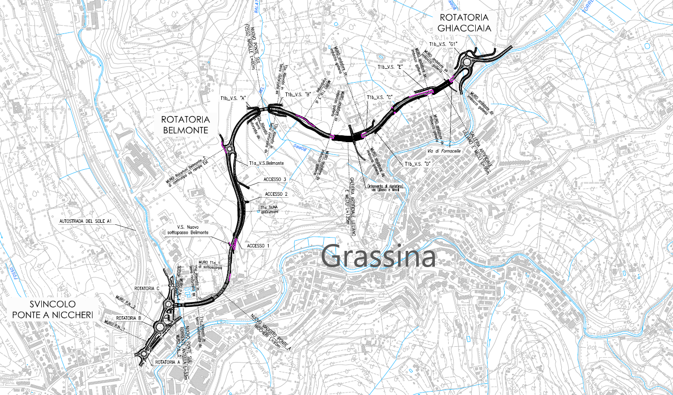 Il progetto è principalmente finalizzato a risolvere le storiche criticità in attraversamento della frazione di Grassina dei flussi di traffico tra Chianti e Area metropolitana sulla direttrice Ponte a Ema – Via Chiantigiana (S.R. 222) e Via di Tizzano (S.P. 56). La prima fase prevede la costruzione di due tratti di strada su nuovo tracciato corrispondenti a due lotti dello stesso appalto che consentiranno di collegare il nodo di Ponte a Niccheri con le due direttrici della S.R. 222 e S.P. 56 bypassando il centro abitato di Grassina.
