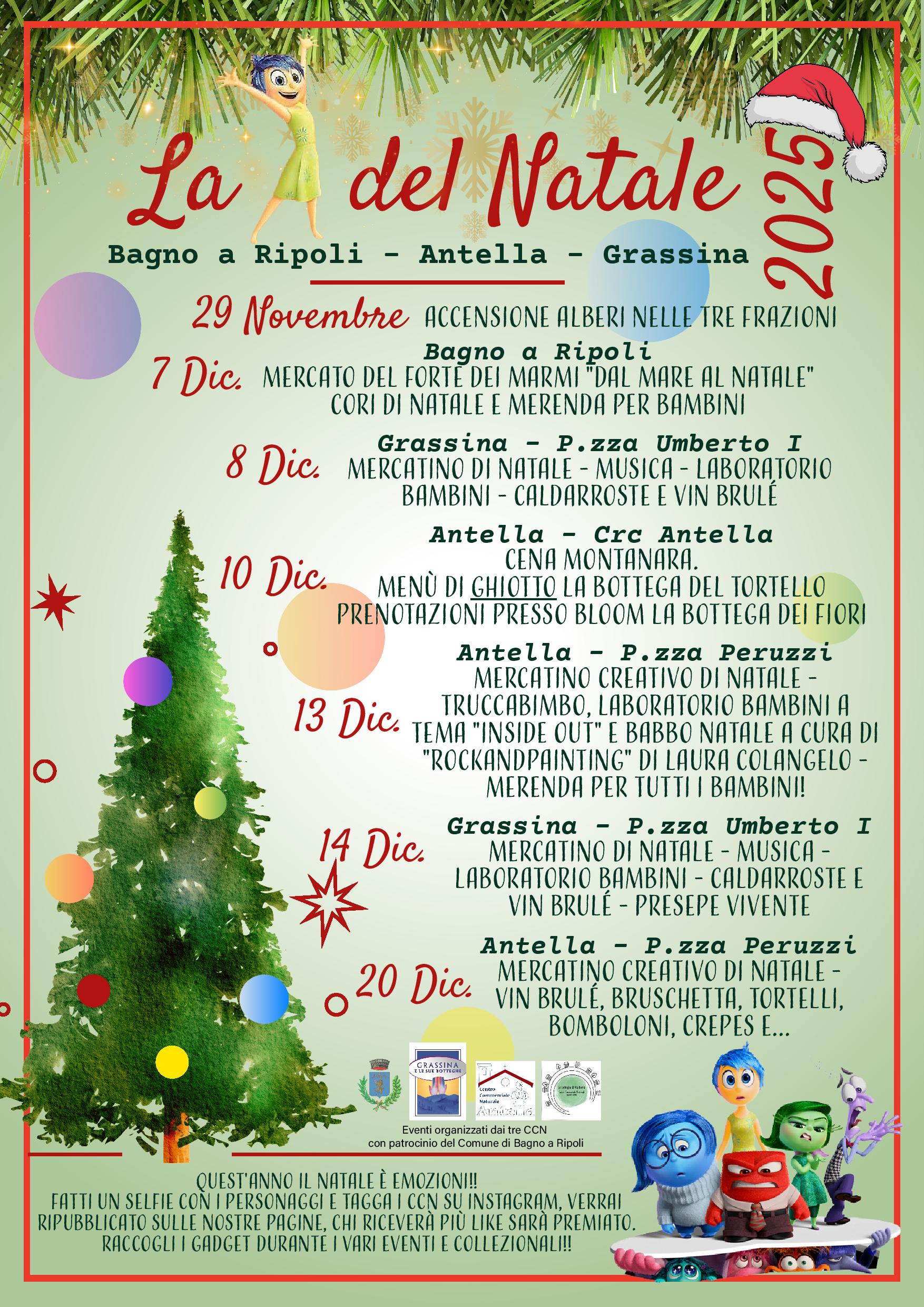 Le tre piazze principali del territorio – piazza Peruzzi all’Antella, piazza Umberto I a Grassina e il piazzale dei Ponti a Bagno a Ripoli – ospiteranno le installazioni luminose dedicate al tema Inside Out. Il personaggio di Gioia, affiancata dai “compagni di emozioni” Tristezza, Rabbia e Ansia, campeggerà in ognuna delle tre frazioni. Un modo per coinvolgere un pubblico trasversale e raccontare la pluralità delle emozioni che caratterizzano questo periodo dell’anno. L’accensione ufficiale delle luminarie avverrà sabato 29 novembre: alle 17.30 a Grassina (dove le luci saranno rosse), alle 18.15 all'Antella (luci blu) e alle 19 a Bagno a Ripoli (luci verdi). Nei tre centri abitati saranno contemporaneamente accesi anche gli alberi di Natale addobbati (a Grassina per la prima volta dopo molto tempo, sarà illuminato l'albero al centro della piazza). Gli abeti illumineranno anche le frazioni di Croce a Varliano e (dalla prima settimana di dicembre) di Villamagna.