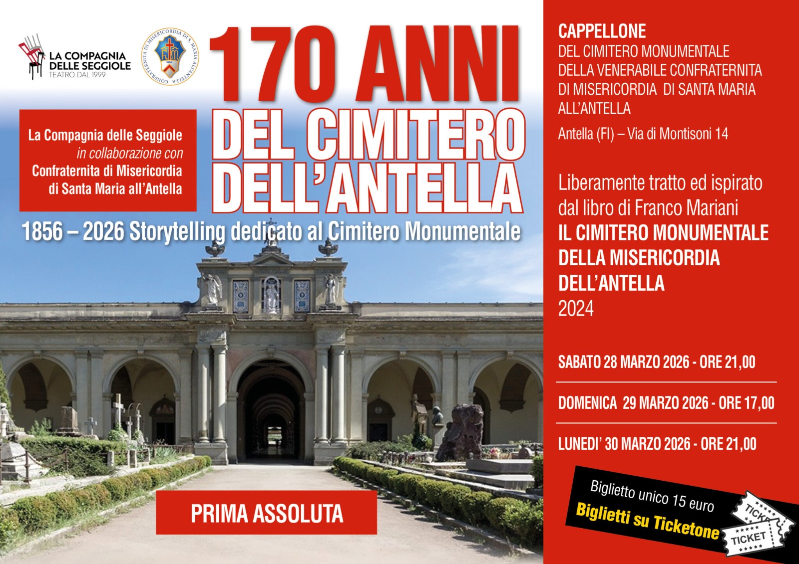 Lo spettacolo, liberamente ispirato al libro “Il Cimitero monumentale della Misericordia dell’Antella” di Franco Mariani, giornalista e confratello della Misericordia prematuramente scomparso nel 2024, è dedicato alla storia, all’arte e alla memoria di uno dei luoghi più significativi del territorio fiorentino. La rappresentazione, una prima assoluta, si svolgerà nel Cappellone del cimitero monumentale.