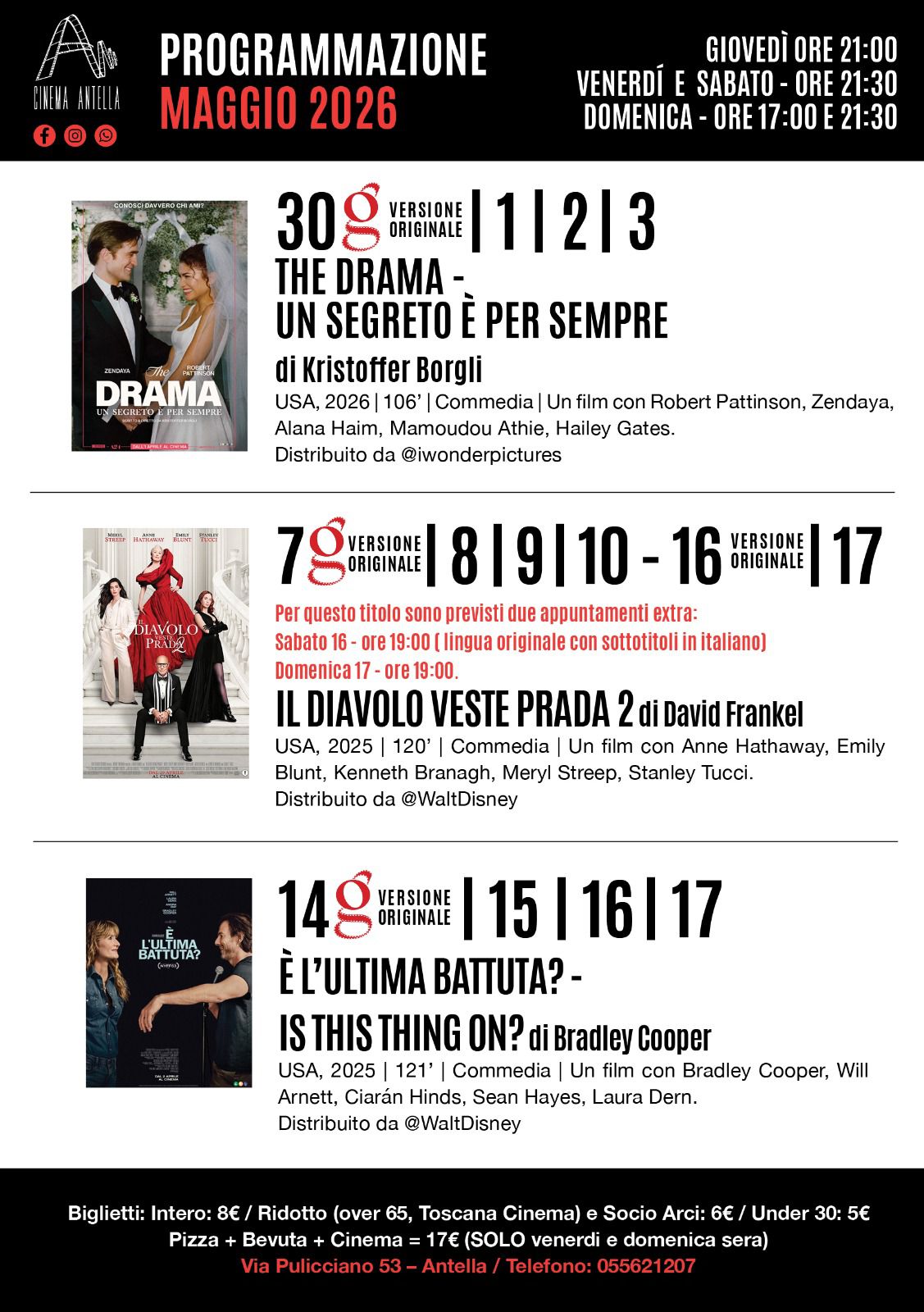 Biglietti: Intero: 8€ / Ridotto (over 65, Toscana Cinema): 7€ / Socio Arci: 6€ / Under 30: 5€. Pizza e Cinema solo il venerdì e la domenica sera: 17€ (per prenotazioni 055 621207).