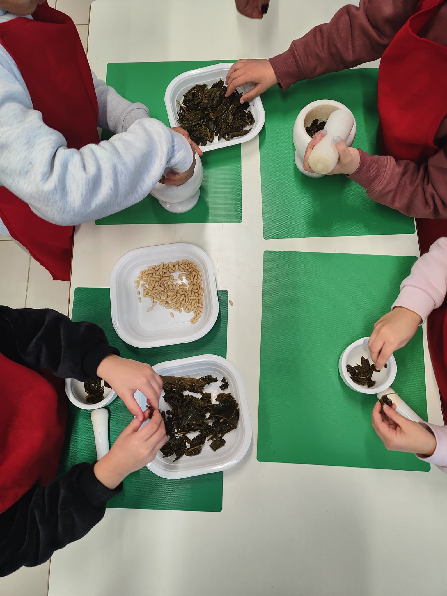 Nei giorni scorsi, i piccoli alunni della classe mista 4-5 anni della scuola dell'infanzia, indossati grembiuli e cuffiette da chef, hanno preparato con le loro mani il pesto per condire la pastasciutta del pranzo, condividendolo anche con la sezione 3 anni.