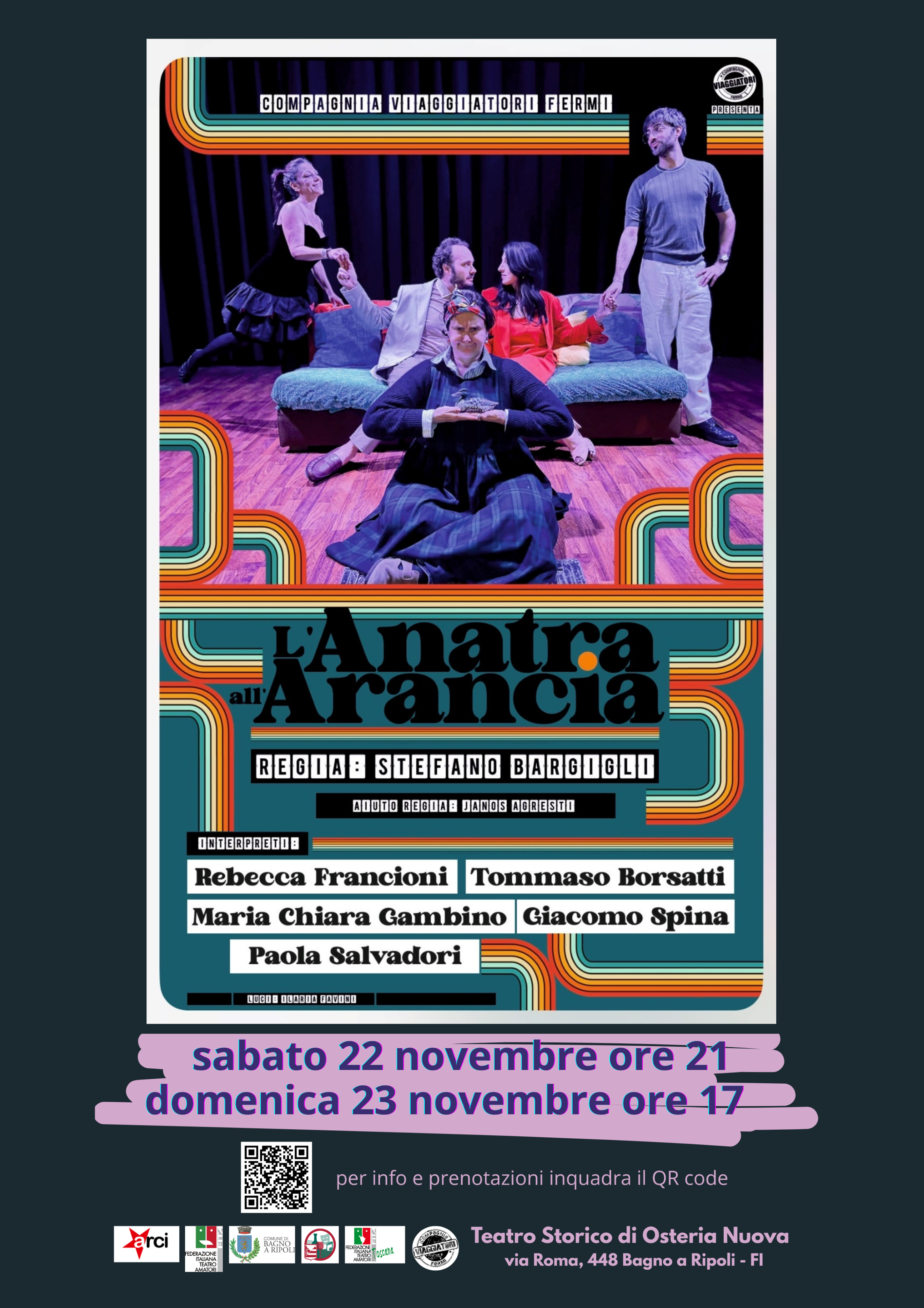 Su il sipario al Teatro storico di Osteria nuova. Riparte questo weekend la stagione teatrale portata in scena dalla Compagnia dei Viaggiatori fermi. Si rompe il ghiaccio con la commedia “L’Anatra all’Arancia” diretta da Stefano Bargigli e tratta dalla piéce di William Douglas-Home e MarcGilbert Sauvajo, in programma sabato 22 (ore 21) e domenica 23 novembre (ore17). In scena Rebecca Francioni, Tommaso Borsatti, Maria Chiara Gambino, Giacomo Spina e Paola Salvadori. Luci Ilaria Favini.