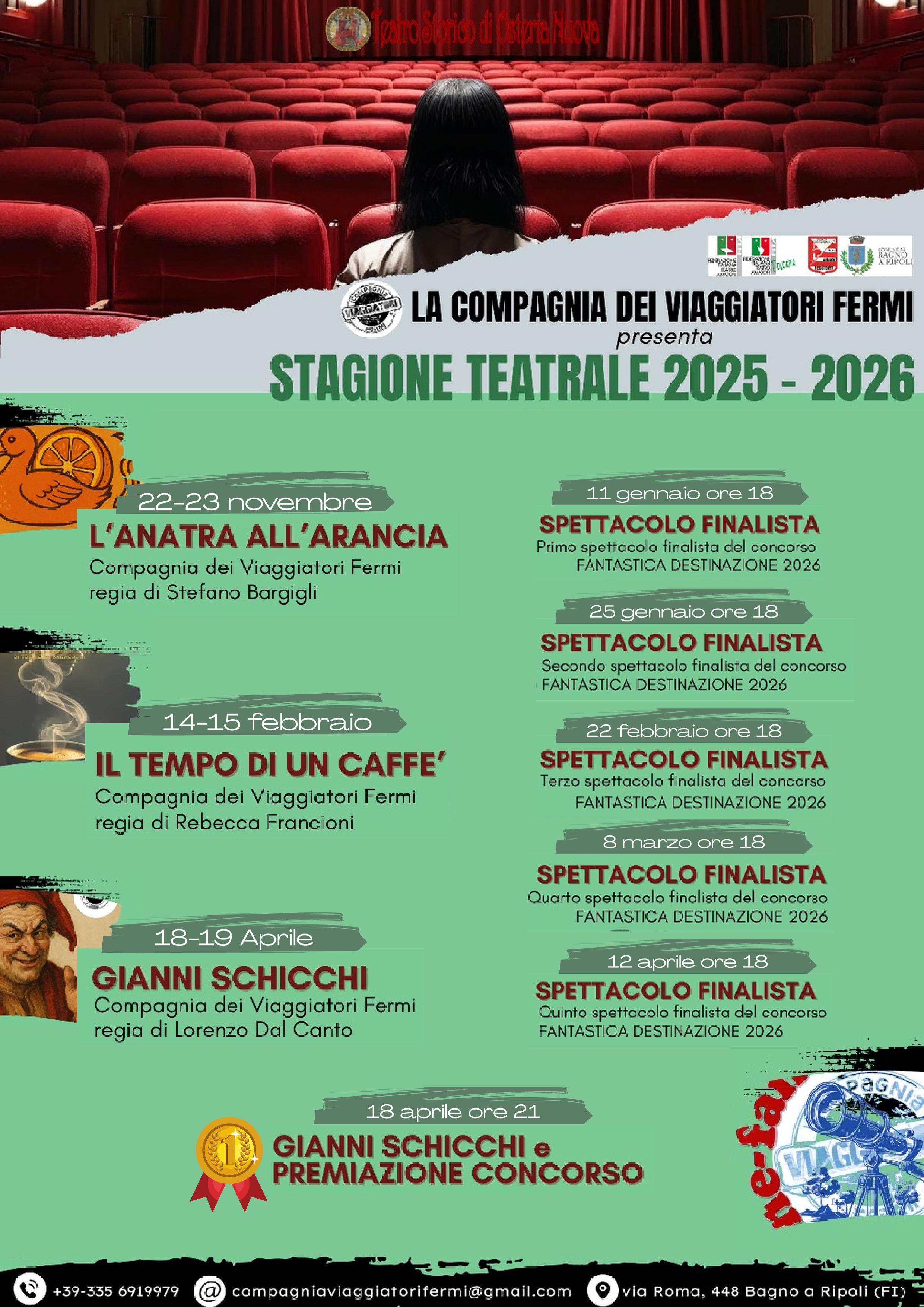 Tre nuove produzioni della Compagnia dei Viaggiatori fermi a cui si aggiungeranno altri cinque spettacoli in programma tra gennaio ed aprile. Si tratta dei finalisti della seconda edizione del concorso di teatro amatoriale Fantastica destinazione, nato per promuovere l’arte teatrale non professionistica e rivolto a tutte le Compagnie e Gruppi teatrali amatoriali del territorio toscano.