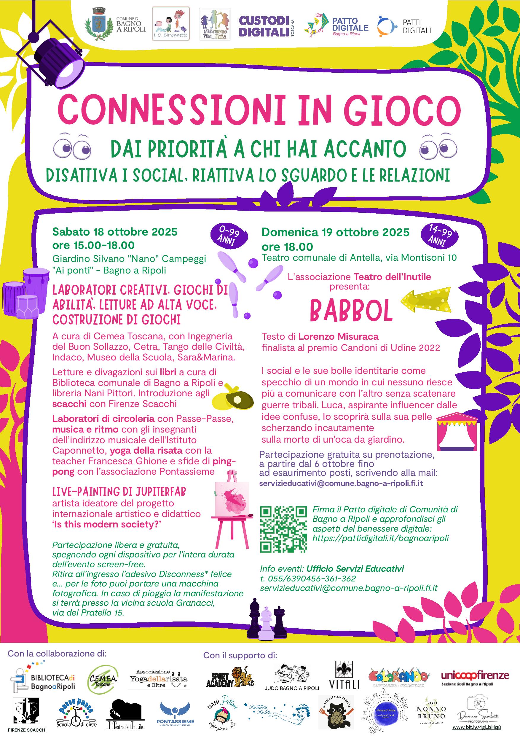 “Connessioni in gioco” è promosso e organizzato dal Comune di Bagno a Ripoli e dal gruppo di lavoro “Patto Digitale Bagno a Ripoli” in collaborazione con Cemea Toscana, Associazione Passe Passe, Firenze Scacchi, Pontassieme, Associazione Yoga della Risata e Oltre, Teatro comunale di Antella, Teatro dell’Inutile, Istituto comprensivo “Antonino Caponnetto” e Istituto comprensivo “Teresa Mattei”, Biblioteca comunale di Bagno a Ripoli. La manifestazione è organizzata con il supporto di Unicoop Firenze – Sezione soci Bagno a Ripoli, Sport Academy, Nani Pittori, Judo Bagno a Ripoli, Pianeta Pulito, Vitali, Osteria Staccia Buratta, Colorando, Nonno Bruno, CCN Le Botteghe di via Roma, Damiano Scarlatti.