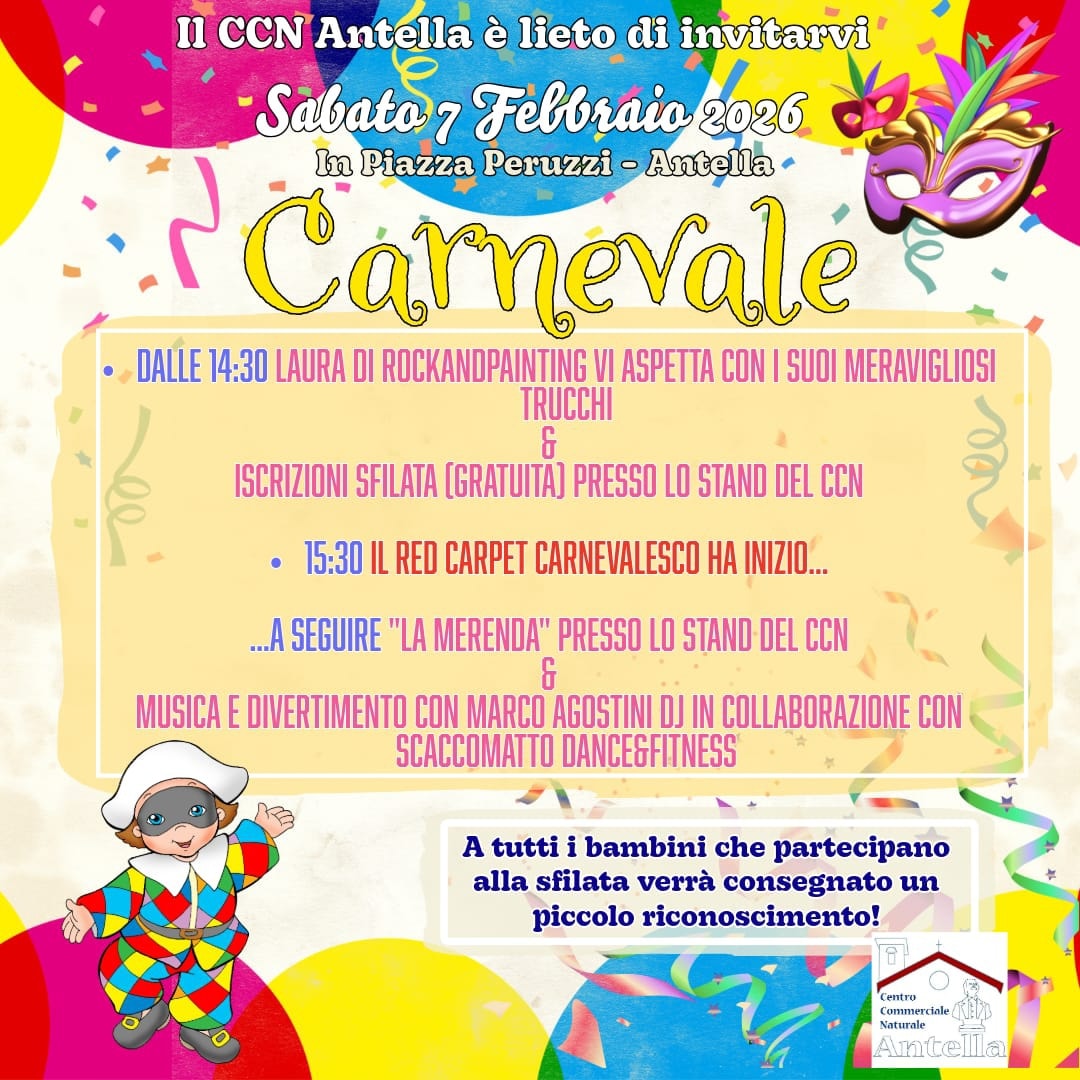 Si parte domani sabato 7 febbraio in piazza Peruzzi: dalle ore 14.00 il CCN Antella aspetta grandi e piccini per una colorata festa. In programma trucchi per bambini con Laura di Rockandpainting. Costumi e maschere saranno protagoniste della sfilata al via alle ore 15.30 (iscrizioni allo stand del CCN). A tutti i bambini partecipanti sarà consegnato un piccolo riconoscimento. A seguire merenda a cura del Centro commerciale naturale, musica e divertimento Marco Agostini Dj in collaborazione con Scaccomatto Dance&Fitness. In caso di maltempo l'iniziativa sarà rimandata a domenica 15 febbraio.