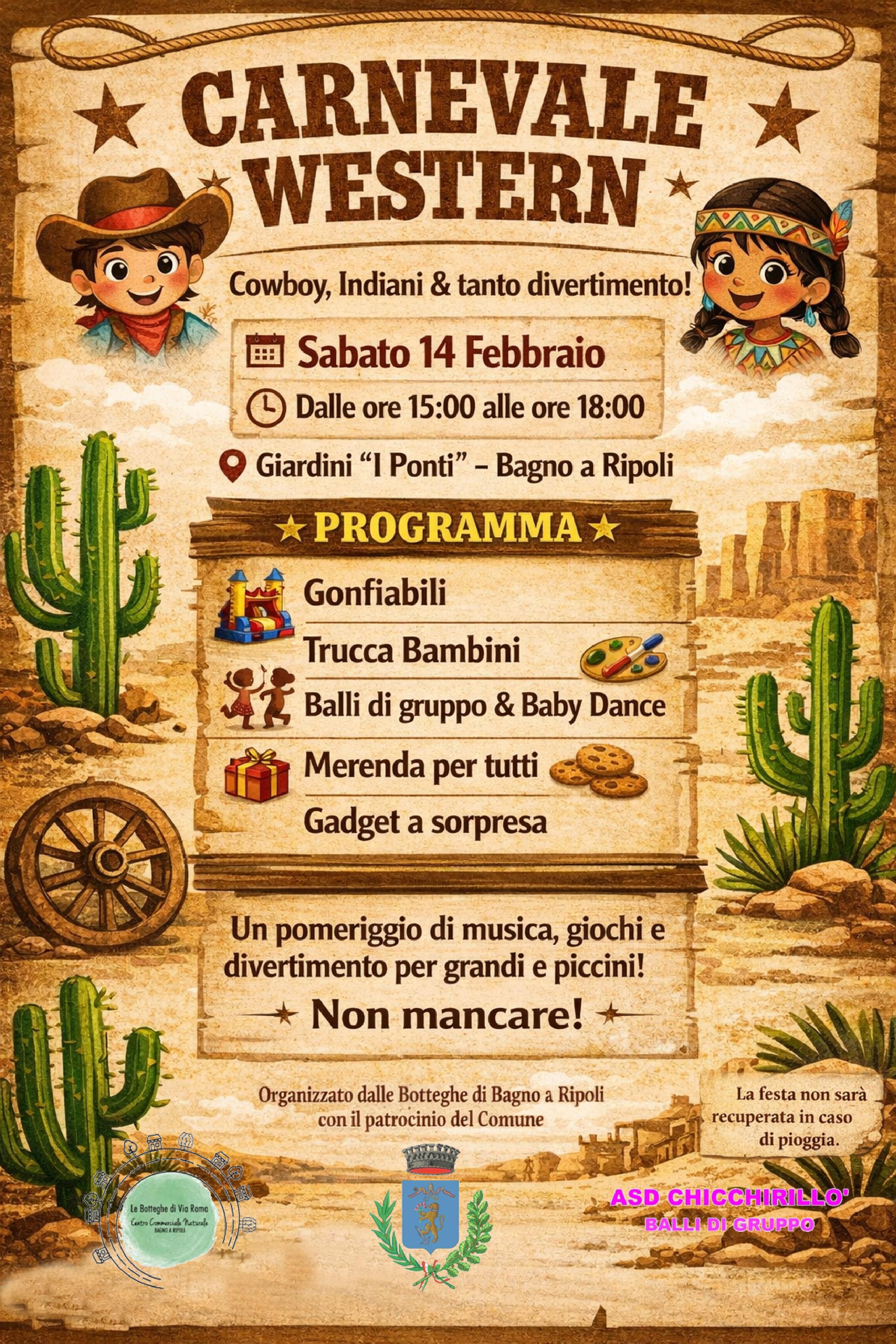Sabato 14 febbraio doppia "fiesta" a Grassina e a Bagno a Ripoli. Dalle 14.30 in piazza Umberto I sfilata in maschera, stand con bomboloni e cioccolata, gonfiabili, brigidini e musica con Muscas Dj. Al costume più bello sarà assegnato il "Premio maschera San Valentino". L'iniziativa è organizzata dal CCN Grassina e le sue Botteghe. In caso di pioggia l'iniziativa si svolgerà il 21 febbraio. Dalle 15.00 ai Giardini Nano Campeggi ai Ponti, nella frazione capoluogo, Carnevale a tema western tra cowboy e tanto divertimento. In programma gonfiabili, truccabimbi, balli di gruppo e baby dance con l'Asd Chicchirillò, gadget a sorpresa e merenda per tutti. Le iniziative sono promosse e organizzate dal CCN Le Botteghe di via Roma. In caso di maltempo l'evento non si svolgerà.